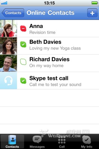 iPhone或iPod touch的 Skype客户端用户可以互相通电话,进行视频聊天或是发送即时讯息。