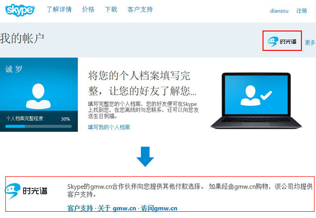 Skype账户属性也变化为“时光谱”,gmw.cn合作伙伴提供客户支持。