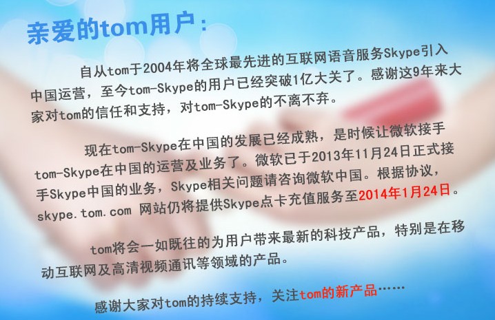 Tom-Skype从今天进入历史,skype.tom.com网站仍将提供Skype点卡充值服务至2014年1月24日。
